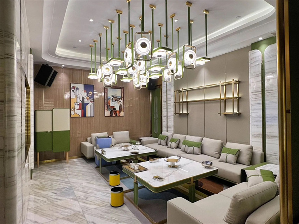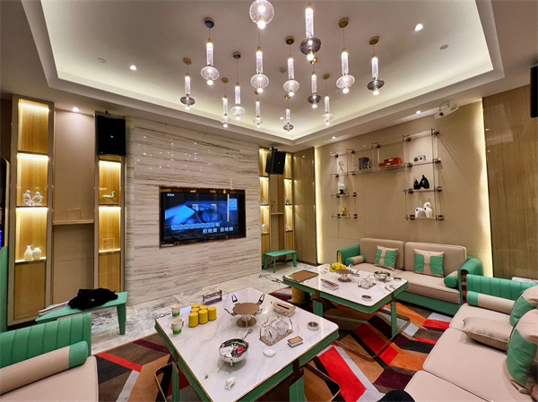 推开水中月KTV的雕花木门,扑面而来的不是喧嚣的霓虹,而是一泓沉静的月光——弧形水景墙倒映着浮动的竹影,青砖与暖木交织的墙面下,是手作陶釉灯盏低垂的柔光。所谓高端,从来不是堆砌材质,而是让每一寸空间都懂得呼吸、记得留白。